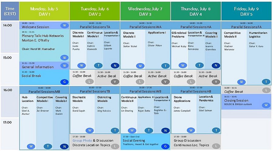 Zoom meetings and main events will be scheduled between 14:00 and 18:00 (CEST/UTC+2) from July 5 until July 9, 2021. Click on the program overview to see the full conference program (without links).